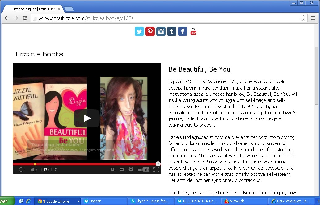 C’est pourquoi Lizzie et ses livres, Lizzie et ses conférences est intéressante. On ne vit pas dans un monde parfait avec des êtres parfaits physiquement, ni intérieurement. On vit dans un monde réel avec des êtres imparfaits, et l’on ferait bien de temps en temps de mettre en avant des êtres, qui nous ressemblent et de mettre en avant d’autres valeurs que celles de l’apparence.